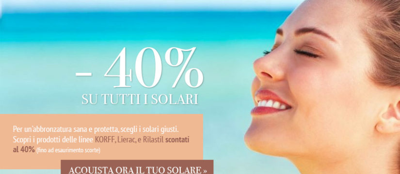 Per un’abbronzatura sana e protetta, scegli i solari giusti. Scopri i prodotti delle linee KORFF, Lierac, e Rilastil scontati al 40% (fino ad esaurimento scorte)